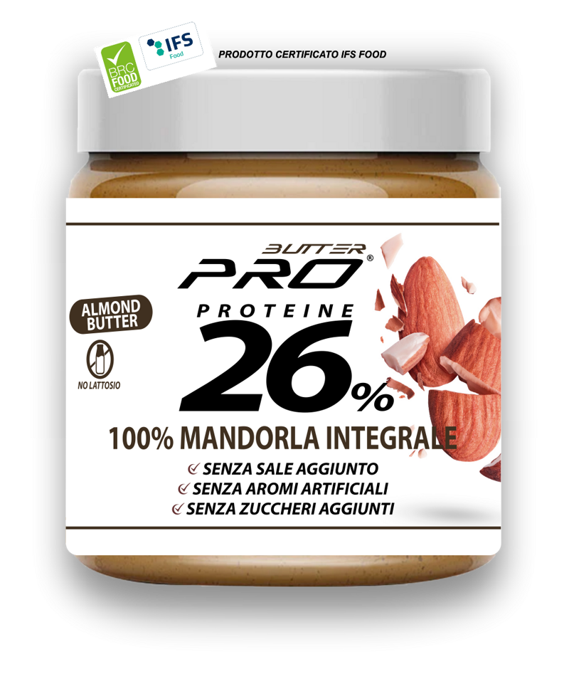 La Pasta di Mandorle 100% integrali di Butter Pro non è solo ricca di proteine, ma l'utilizzo totale della sua pellicina lascia intatte le fibre presenti in questa speciale variante di frutta secca.